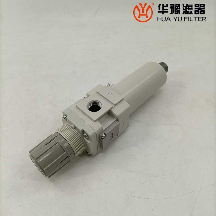 從進口流入的壓縮空氣,經(jīng)導(dǎo)流片的切線方向的缺口強烈旋轉(zhuǎn),液態(tài)油水及固態(tài)污染物受離心作用,被甩到水杯內(nèi)壁上,再流至底部。除去了液態(tài)油水及雜質(zhì)的壓縮空氣,通過濾芯進一步清除微小固態(tài)顆粒,然后從出口流出。 空氣中的溶膠狀的威力是能通過5um的濾芯的,擋水板能防止下部的液態(tài)油水被卷口氣流中,聚積在水杯內(nèi)的冷凝水,按動手動按針,便可以從排水口指出。濾芯有金屬網(wǎng)型、燒結(jié)型和纖維凝聚型。燒結(jié)型有銅珠燒結(jié)、樹脂燒結(jié)和陶瓷燒結(jié)等。銅珠燒結(jié)濾芯的表面和內(nèi)部都起到過濾作用,強度好,***,可清洗幾次重復(fù)使用。纖維凈聚型有樹脂類,人造纖維類材料等。金屬網(wǎng)型知識表面起到過濾作用。