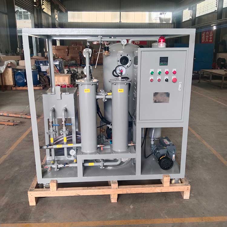 真空濾油機是根據(jù)水和油的沸點不同而設(shè)計的,它由真空加熱罐、精濾器、初濾器、真空泵、排油泵以及電氣柜組成的。真空泵將真空罐內(nèi)的空氣抽出形成真空,外界油液在大氣壓力的作用下,經(jīng)過油入口管道進入初濾器,清除較大的顆粒,然后進入加熱罐內(nèi)經(jīng)過加熱到40~75℃的油進入真空罐內(nèi),油中的水份急速蒸發(fā)成水蒸氣并連續(xù)被真空泵吸入油水分離器內(nèi),分離器內(nèi)的水蒸氣經(jīng)冷卻后還原成水后放出。在真空加熱罐內(nèi)的油液被排油泵排入精濾器通過濾芯將微粒雜質(zhì)過濾出來。從而完成真空過濾迅速除去油中雜質(zhì)、水份、氣體的全過程,使?jié)崈舻挠蛷某隹谔幣懦鰴C外。